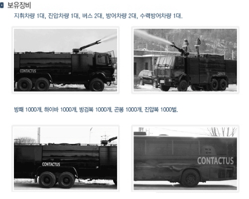 실제 컨택터스는 자사 홈페이지를 통해 "국내 최대 규모의 시위 진압 장비를 보유한 대한민국 시위·집회 해결사"라면서 "가장 공격적이라고 알려진 이른바 '히틀러 경비견', 방패·헬멧·진압복·곤봉 1000세트와 지휘차량, 진압차량, 항공 채증용 무인헬기까지 갖췄다"고 홍보해 왔다. (☞관련 기사 : '폭력업체' 컨택터스, 알고보니 군사조직 방불 충격)