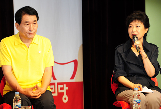 | ▲ '경선 보이콧'을 선언한 김문수, 김태호, 임태희 후보의 불참으로 5일 서울 상암동 누리꿈스퀘어에서 열린 20대 정책토크는 안상수 후보(왼쪽)와 박근혜 후보만 참석했다. ⓒ뉴시스 |