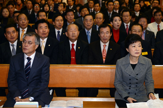 | ▲ '같은 장소, 다른 시선'. 박근혜 새누리당 후보(오른쪽), 문재인 민주통합당 후보가 14일 서울 여의도순복음교회에서 열린 국가조찬기도회에 참석해 각각 다른 곳을 바라보고 있다. ⓒ연합뉴스 |