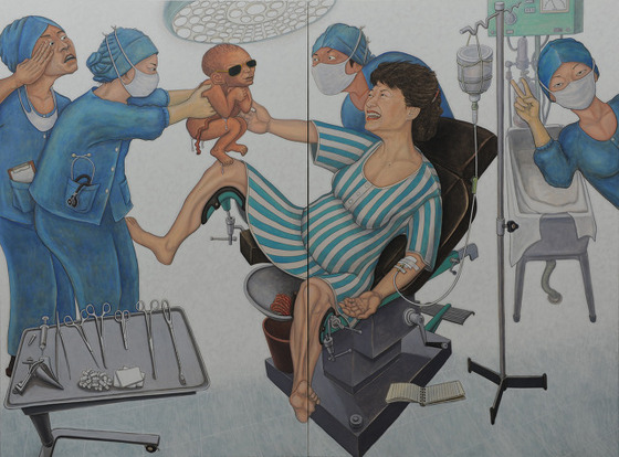 | ▲ 홍성담_<골든타임-닥터 최인혁, 갓 태어난 각하에게 거수경례하다> 194×265cm, 캔버스에 유채, 2012. ⓒ평화박물관 |