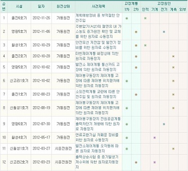 | ▲ 2012년 동안 발생한 원전 고장 일지. ⓒ원전안전운영정보시스템 |