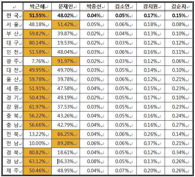 중앙선관위에 따르면 총 선거인수는 4050만7842명이며 이중 75.8%가 투표에 참여해 투표자수는 3071만1459명으로 집계됐다. 지역별로 보면 박 당선인이 서울과 광주·전남·전북 등 호남을 제외한 전국 모든 곳에서 문 후보에 앞섰다.