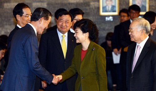 | ▲ 2012년 11월 8일 박근혜 당시 후보자가 전경련 회원을 만나는 모습. ⓒ연합뉴스 |