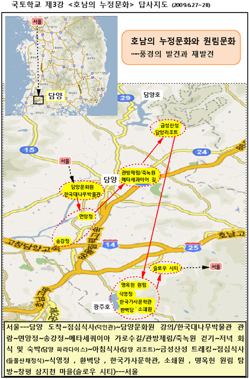 담양문화원 사무국장이자 시인인 고재종 선생으로부터 '담양 정자문화'에 관한 특강을 듣는다. 담양문화원은 2008년에 <담양의 누정기행-자연에 안긴 예술과 풍류의 도량>이라는 책을 펴내어 큰 호응을 받은 바 있다. 이어서 담양의 역사문화생태 연구가인 이채연 선생의 안내를 받는다.