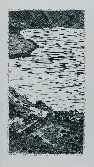 한편 목판화가인 김억 선생이 6월 답사에도 소중한 작품을 제공하셨습니다. 담양 광주호를 따라 임억령의 식영정을 비롯하여 조어대, 김윤제의 환벽당, 김덕령의 취가정, 양산보의 소쇄원, 전신민의 독수정이 길을 따라 양옆으로 배치된 것을 묘사한 작품입니다.