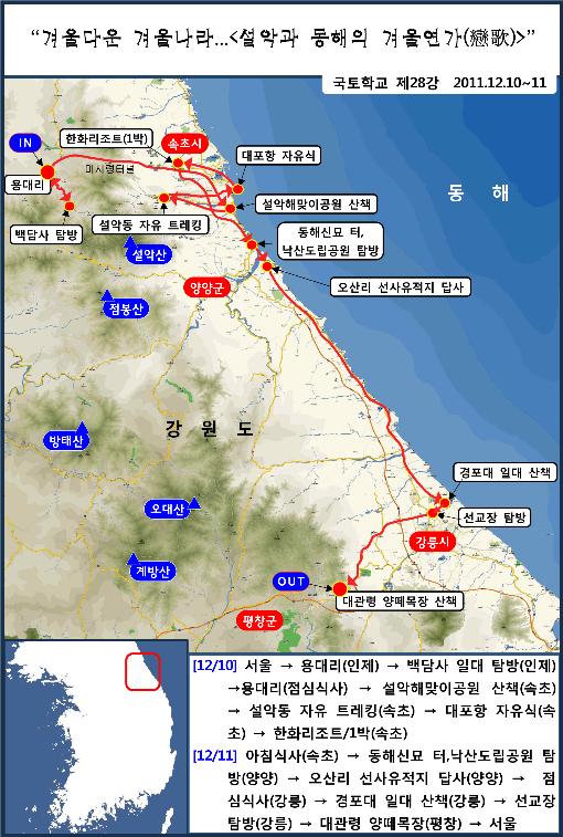 국토학교는 강원 지역을 여러 차례 지나 다녔으나 <설악-동해 특집>을 마련하는 것은 이번이 처음이다. 왜 겨울에 찾아가려 하는가 하는 데 대해서는 겨울다운 겨울나라, 설국(雪國)의 소망을 새겨보아야 할 바가 있기 때문이라고 설명하고 싶다.