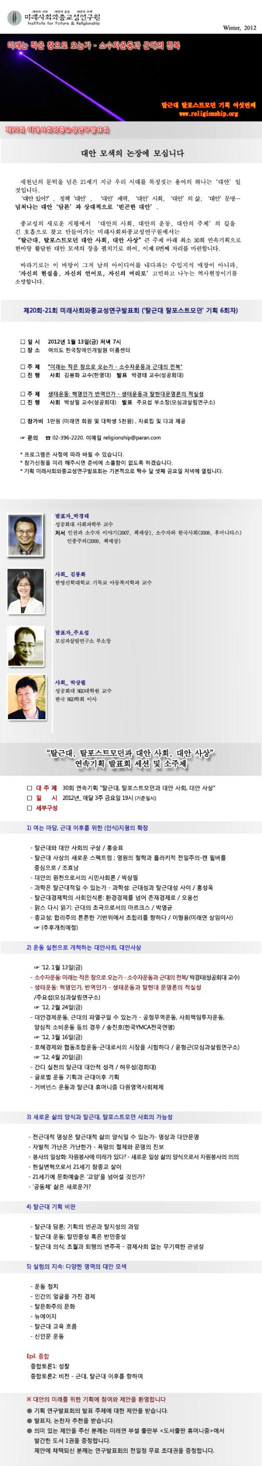 13일(금) 19시 여의도 이룸센타에서 열리는 이번 발표회는 20회, 21회 함께 진행된다. 20회는 박경태 성공회대 교수가 '미래는 작은 창으로 오는가-소수자 운동과 근대의 전복'를 주제로 발표에 나서고, 사회는 김봉화 한영대 교수가 맡는다. 21회는 주요섭 모심과살림연구소 부소장이 '생태운동:혁명인가 반역인가-생태운동과 탈현대문명론의 적실성'이란 주제로 발표한다. 사회는 박상필 성공회대 교수가 진행한다.