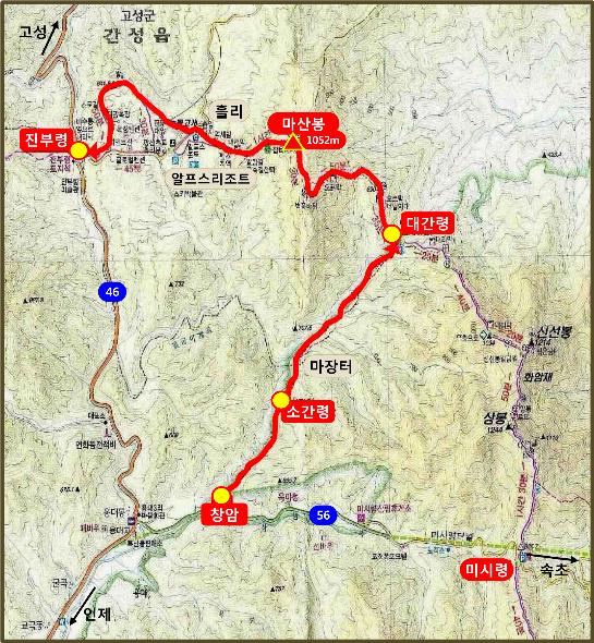 - 산행코스 : 56번 국도 창암-소간령-마장터-대간령-마산봉-알프스리조트-진부령