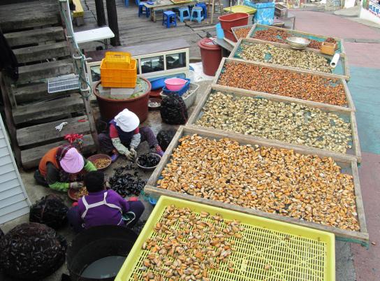 함구미마을, 방파제 주변에는 여행객이 떼로 몰려 웅성거립니다. 무슨 구경거리라도 생긴 걸까. 사람들 틈을 비집고 들어가 보니 할머니 한 분이 맨손으로 물고기를 잡고 있습니다. 썰물 때, 물이 빠지자 방파제 안에는 작은 물웅덩이가 생겼습니다. 때를 놓쳐 미처 빠져나가지 못한 물고기들이 웅덩이에 갇혔습니다. 어린 숭어 떼. 돌로 쌓은 방파제 석축 사이에는 그물이 쳐져 있습니다. 물고기들은 함정에 빠진 것이지요.