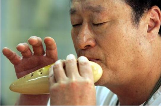 | ▲ "날아다니는 풀벌레들을 모여들게 하는 불가사의한 소리"라는 오카리나를 연주중인 유승엽 교장선생님 ⓒ오카리나학교 |