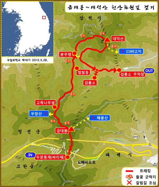 이날 걷기는 두문동재(싸리재)를 출발하여 금대봉→고목나무샘→분주령→대덕산→검룡소→ 검룡소 주차장에 이르는, 약 10km 코스로 점심(도시락)시간과 충분한 휴식시간을 포함해 5시간쯤 걸립니다.