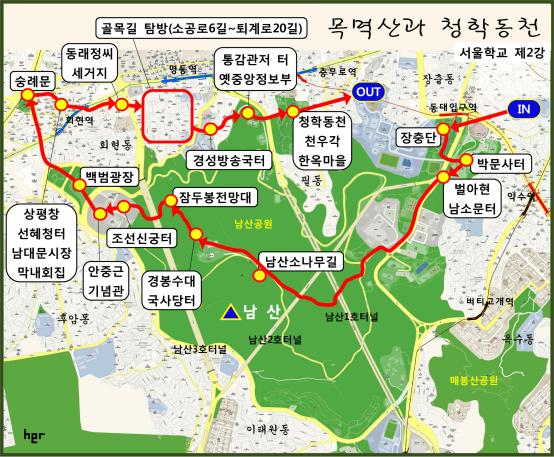 장충단→박문사 터→벌아현→남소문 터→남산 소나무길→경봉수대→국사당 터→잠두봉전망대→조선신궁 터→안중근기념관→백범광장→숭례문→상평창 선혜청 터→점심(막내회집)→남대문시장→동래정씨 세거지→골목길 탐방(소공로6길-퇴계로20길)→경성방송국 터→통감관저 터→옛 중앙정보부→청학동천→천우각→한옥마을