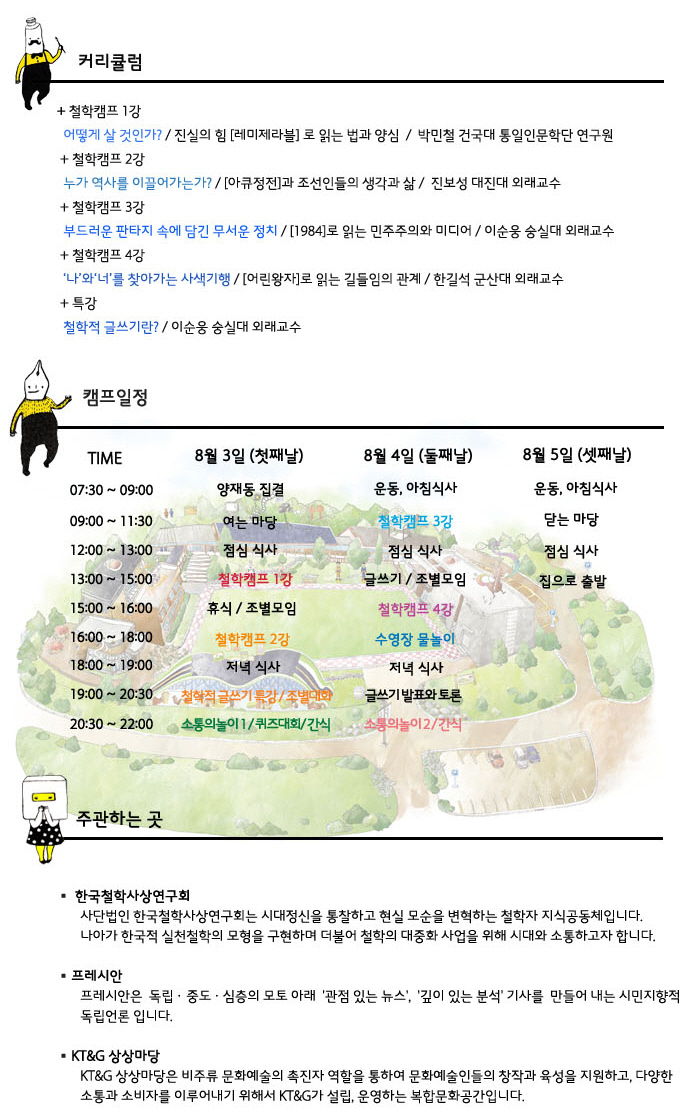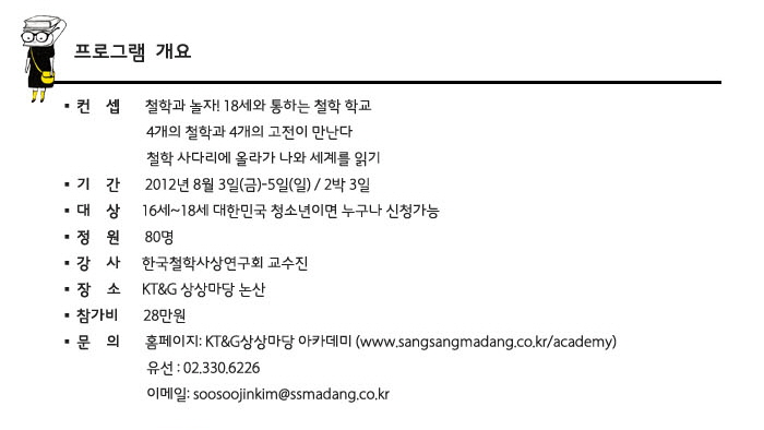이번 여름에는 '레미제라블', '아큐정전', '1984', '어린왕자' 등 우리들의 마음을 울리는 4권의 고전과 함께 철학여행을 떠나려 합니다. 고전을 배우고 철학으로 서로 대화하며 놀아봅시다. <한국철학사상연구회>의 훌륭한 교수님들이 2박 3일 동안 여러분의 멘토가 돼주실 것입니다.