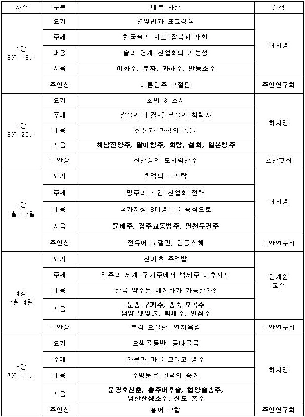 한국술은 크게 막걸리(탁주), 약주(청주), 소주로 구분됩니다. 막걸리학교에서는 지난 3년 동안 흥미진진하게 막걸리 강좌를 진행해왔습니다. 이제 14기에 이르게 된 막걸리강좌와 짝을 이룰 한국명주학교를 새롭게 열게 되었습니다.