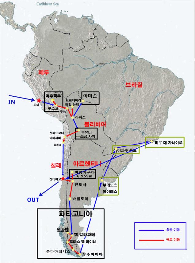 49일코스(1안)의 경우, 페루 리마로 들어가 잉카제국의 옛 수도 쿠스코, 잃어버린 도시 마추픽추, 세계 최대의 담수호 티티카카호, 아마존 정글 탐험(루레나바께), 세계 최대 소금사막 우유니, 지구 탄생의 비밀을 간직한 아따까마 사막, 남미 최고봉 아콩카구아, 남미의 알프스 바릴로체, 남미의 보석 파타고니아, 남극의 관문 아수아이아, 지구 최대규모의 폭포 이과수 등을 탐사하고 부에노스 아이레스를 거쳐 리우 데 자네이로에서 나옵니다. 49일코스는 안데스를 따라 남미 전체를 일주하는 프로그램입니다.