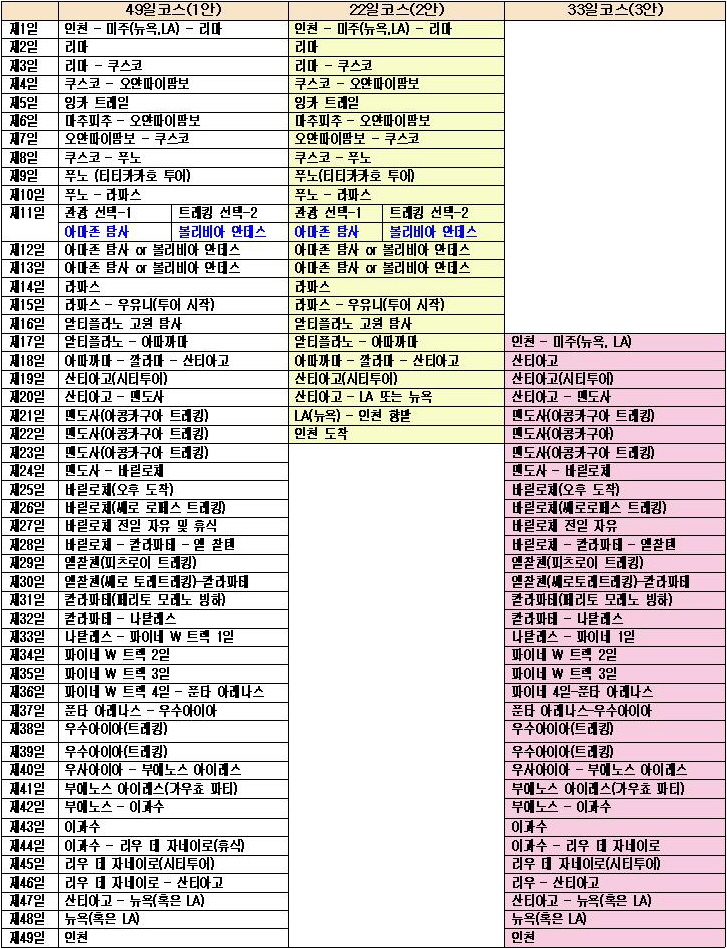 남미 <안데스 비경 트레킹>은 총 49일코스(1안)를 기본 일정으로 잡고 있습니다. 여기에 개인 취향과 사정에 따라 22일코스(2안), 33일코스(3안),를 선택할 수 있도록 했습니다.