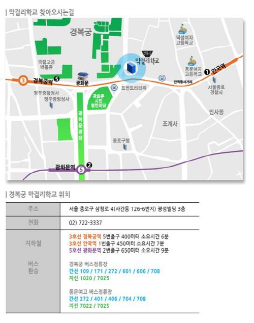 자세한 내용과 문의는 전화 02-722-3337, 막걸리학교 홈페이지 www.soolschool.com ,