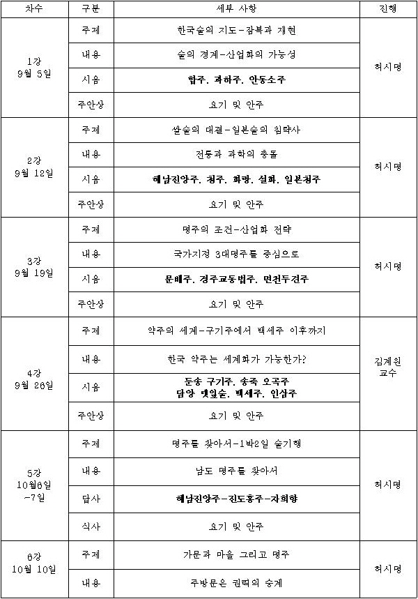 제2기 한국명주학교는 9월 5일부터 11월 7일까지 매주 수요일 10강으로 진행됩니다. 한국 술의 분야별 전문가를 모시고, 한국 명주를 소개하고, 맛보고, 평가하는 자리입니다. 한국의 명주 50여 종을 맛보게 되며, 그에 어울리는 주안상이 준비됩니다. 향기로운 술과 웅숭깊은 이야기와 고상한 벗들이 한국명주학교와 함께 할 것입니다. 한국명주 속에서 우리 문화의 진경을 만끽해 봅시다.