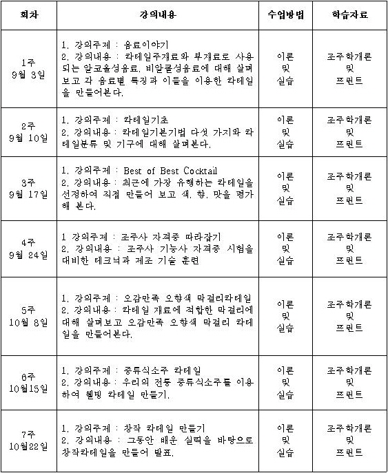 강 의 명 : 제1기 한국술 창작 칵테일 교실
