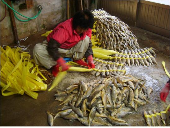 | ▲ 소금 간을 한 조기를 엮어서 해풍에 말리면 굴비가 탄생한다. ⓒ섬학교 |