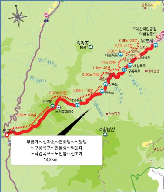 낙영폭포, 광폭포, 삼폭포, 백운대와 만물상, 구룡폭포, 세심폭포, 삼선암, 식당암, 연화담, 십자소를 거쳐 무릉계, 소금강 입구 주차장까지는 약 13km로, 점심시간에 휴식시간 포함, 약 6시간 30분을 잡고 있습니다.