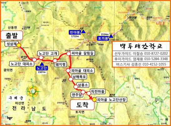 출발 10분전에 도착하여 버스에 탑승하세요. 버스 앞에 <백두대간학교> 표지가 붙어 있습니다. 김종선 기사님 전화번호는 010-4152-1055 입니다.
