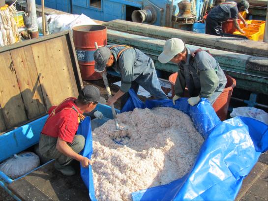 | ▲ 갓 잡아온 새우를 배 안에서 소금에 저려 새우젓을 담고 있다. Ⓒ섬학교 |