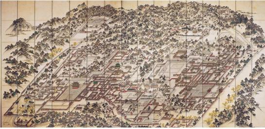 | ▲ 창덕궁과 창경궁을 조감도 형식으로 그린 동궐도(東闕圖). 조선 후기 대표적인 궁궐 그림으로, 비단 바탕에 채색. 가로 576cm, 세로 273cm. 국보 제249호. Ⓒ문화재청 |