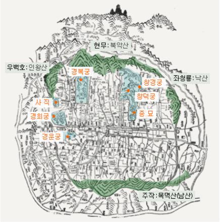삼각산의 세 봉우리인 백운대, 인수봉, 만경대에서 북한산성 능선을 타고 남쪽으로 내려온 지맥이 문수봉(文殊峰)에서는 서쪽으로 북한산성을 둘러쳤고 보현봉(普賢峰)에서는 남쪽으로 도성(都城)을 향하여 그 지맥을 뻗었는데, 형제봉 지나 구준봉 건너 북악(北岳)에 이르러 다시 서쪽으로 인왕산(仁王山)으로 이어지면서 한양 도성의 우백호(右白虎)를 이루고, 동쪽으로 낙산(駱山)으로 이어지면서 좌청룡(左靑龍)을 이루었으나 좌청룡의 산세가 우백호에 비하여 급격히 낮아져 여러 가지 비보책(裨補策)이 마련되기도 하였습니다.