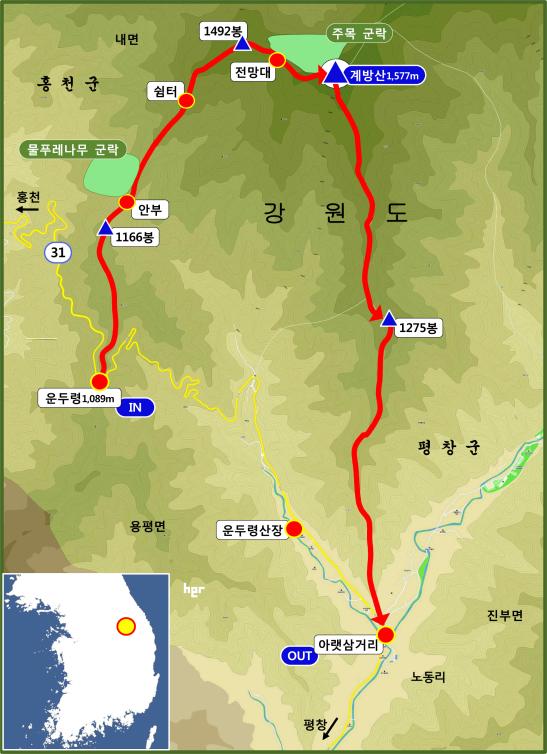이날 산행은 운두령(1,089m)→1166봉→안부→물푸레나무 군락→쉼터→1492봉→주목 군락→계방산 정상(1,577m)에 올랐다가 남쪽 능선으로 하산, 1275봉→아랫삼거리에 닿습니다. 약 9km를 천천히 걸으며 휴식시간과 간식시간 포함, 5시간 잡습니다.