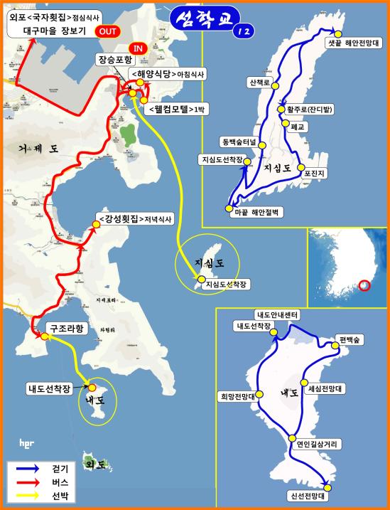 *내도는 태풍만 아니면 배가 뜨지만 지심도는 바람이 심히 불면 못 뜰 가능성도 있음. 혹, 지심도행 배가 못 뜰 경우 내도 숲길 걷기와 거제 해변 걷기(지세포→서이말등대→공곶이→와현해변→구조라)로 대체합니다.