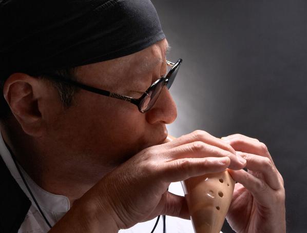 | ▲ "날아다니는 풀벌레들을 모여들게 하는 불가사의한 소리"라는 오카리나를 연주중인 유승엽 교장선생님 ⓒ오카리나학교 |
