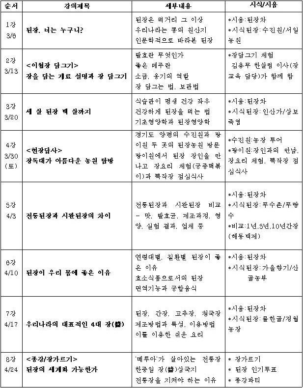 된장학교는 된장에 관한 인문학적 강의와 함께 장 담그기를 직접 체험합니다. 아울러 전국의 <10대 명품된장>을 맛볼 수 있는 기회를 가지며(각 100g씩 제공), 또한 1년, 5년, 10년 숙성된 간장을 비교·시식해보는 시간도 갖습니다. 또 한 번의 유명 된장농원 현장답사도 하며 강의 때마다 다양한 된장차도 맛볼 수 있습니다.
