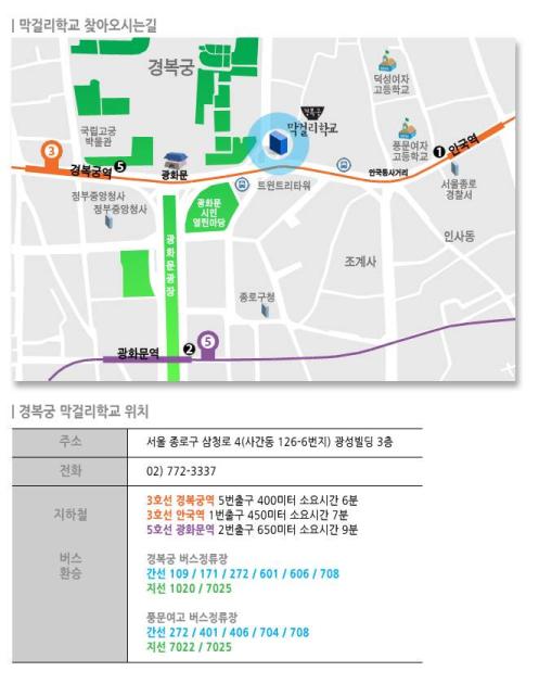 된장학교 봄학기 강의는 막걸리학교 강의실(서울 종로구 삼청로 4 또는 사간동 126-6 광성빌딩 3층, 지하철 3호선 경복궁역 5분 출구 나와서 400m, 아래 약도 참조)에서 열리고, 참가비는 25만원(강의비, 된장 담그기 재료비, 명품된장 시식 10회 및 1년, 5년, 10년 간장 시식비, 된장차 시음비 등 포함, 제4강 현장 답사비 제외)입니다.