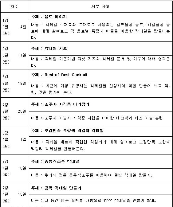 <한국술 창작 칵테일 교실> 제2기 참가 안내와 강의 일정은 다음과 같습니다.
