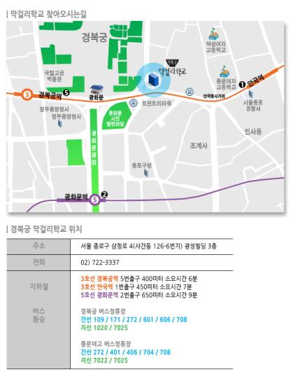 자세한 내용과 문의는 전화 02-722-3337 막걸리학교 홈페이지 www.soolschool.com 막걸리학교 카페 http://cafe.naver.com/urisoolschool 이메일 soolschool@naver.com을 이용해주세요.