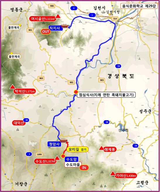 수도암에서 청암사까지 김천시에서 조성한 '모티길'(일부)을 걸을 예정입니다. '모티'는 경상도 사투리로 '모퉁이'라는 뜻이니, 이 길은 곧 수도산의 모퉁이길입니다. 산길이지만 그리 험하지는 않습니다.