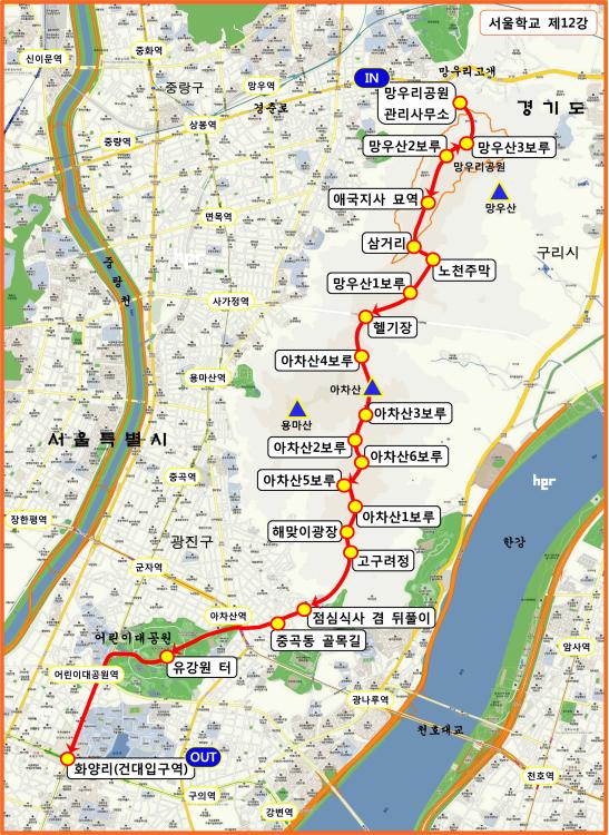 망우리공원 관리사무소 앞→애국지사 묘역(만해 한용운 묘/죽산 조봉암 묘)→삼거리→노천주막→망우산3보루→망우산2보루→망우산1보루→헬기장→아차산4보루→아차산3보루→아차산2보루→아차산6보루→아차산5보루→아차산1보루→해맞이광장→고구려정→점심식사 겸 뒤풀이(<송강>에서 막걸리를 곁들인 해물파전, 동태전골 또는 김치찜전골요리)→중곡동 골목길→유강원 터→화양리(건대입구역)