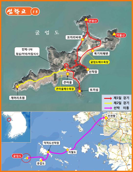 큰마을→목기미해변→연평산→코끼리바위→큰마을→토끼섬→숙소