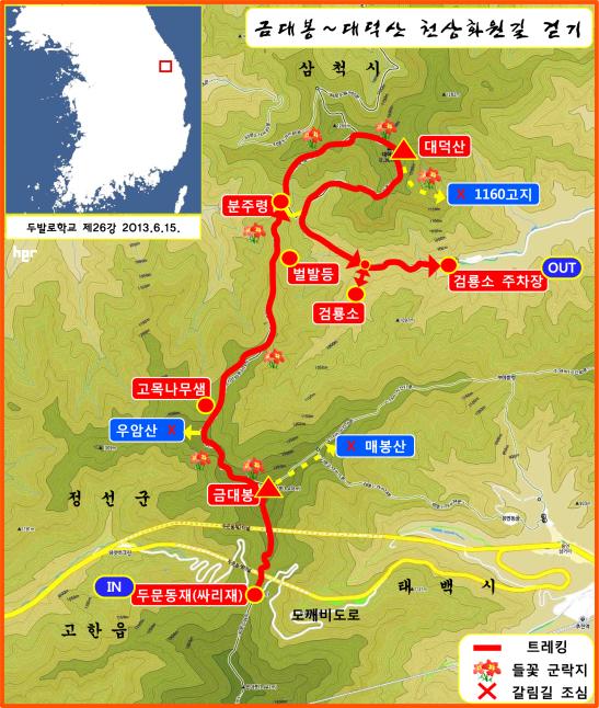 잠깐! 금대봉∼대덕산 구간은 자연생태보전지역으로 지정돼있고 현재 무분별한 출입과 산림 훼손을 막기 위해 '사전 예약제'로 출입을 허용하고 있습니다. 사전 단체예약은 안 되고 개인예약만 받고 있습니다. 개인의 사전예약 절차를 거치려면 6월 10일까지 참가접수를 마쳐야 합니다. 참가접수를 6월 10일로 마감합니다^^