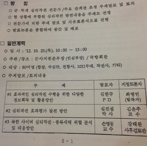 ▲ 합참의 '국방심리전정책발전세미나' 계획 중. 손영동 교수는 대부분 군인들을 상대로 한 이 세미나에 발제자로 참여할 당시 이미 박근혜 캠프에서 활동하고 있었다. ⓒ프레시안