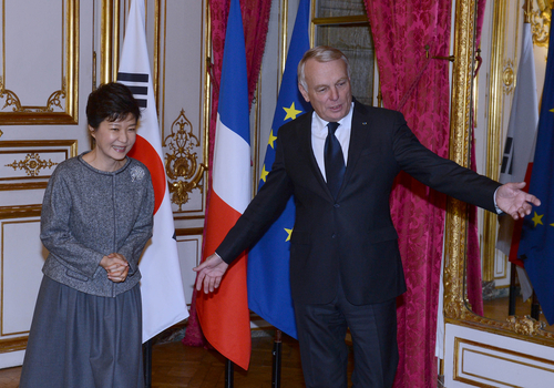 ▲ 박근혜 대통령이 4일 오후(현지 시각) 파리 마티뇽궁에서 열린 장-마르크 에로 프랑스 총리의 안내로 만찬장으로 향하고 있다. ⓒ연합뉴스