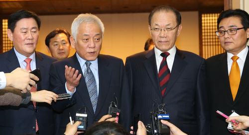 | ▲ 여야는 3일 밤 국회 의장실에서 4자회담을 계속해 국정원 개혁특위 구성에 합의하고 예산안과 법안을 연내 처리하는 등 4일부터 국회 일정을 정상화하기로 뜻을 모았다. 김한길 민주당 대표, 황우여 새누리당 대표가 회담을 의장실 앞에서 취재진의 질문에 답하고 있다. 2013.12.3 ⓒ연합뉴스 |
