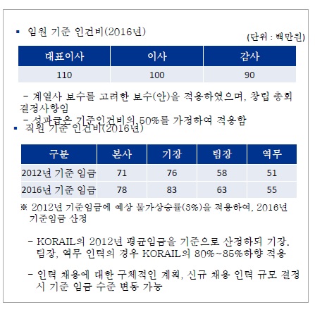 이 보고서에 따르면, 향후 출범할 수서발KTX주식회사 대표이사 연봉은 1억1000만 원이고, 이사는 1억 원으로 책정돼 있다. 감사는 연봉 9000만 원이다. 성과급은 언급돼 있지 않지만 코레일 수준에 비춰보면 약 4000~8000만 원가량이 매년 임원들에게 추가로 더 주어질 가능성이 높다.