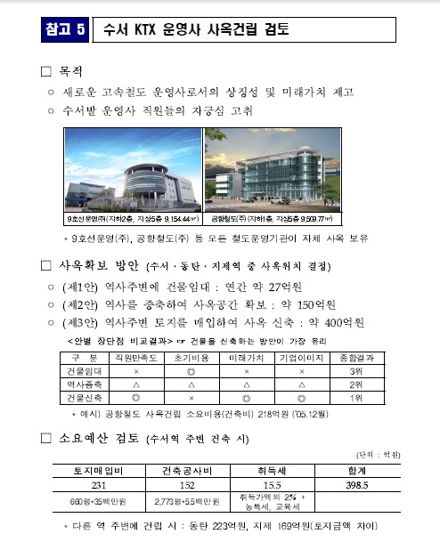코레일은 이 자료를 통해 사옥 건립과 관련해 3가지 안을 제시했다. 첫째, 역사 주변 건물 임대(연간 약 27억 원), 둘째, 역사 증축 통한 사옥 공간 확보(약 150억 원), 셋째, 역사 주변 토지를 매입해 사옥 신축(약 400억 원) 등이었다. 이어 코레일은 비용이 가장 많이 드는 '건물 신축'안이 가장 유리하다는 결론을 내렸다.