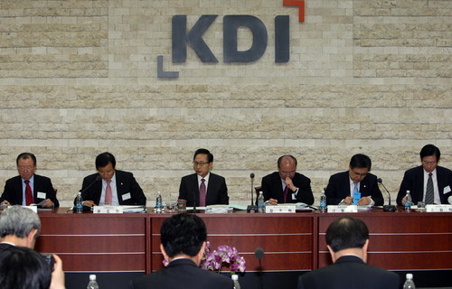 | ▲ 이명박 대통령이 최근 강만수(왼쪽 끝) 경제특보 등 '747 정책' 입안자들을 다시 중용하고 있지만, '747 공약'의 목표 달성은 이미 물건너 간 것으로 보인다. ⓒ연합뉴스 |