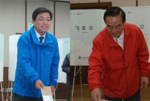 | ▲경기 화성갑 지역구에 출마한 새누리당 서청원 후보(오른쪽)와 민주당 오일용 후보가 지난 25일 사전투표를 하고 있다. ⓒ프레시안 |