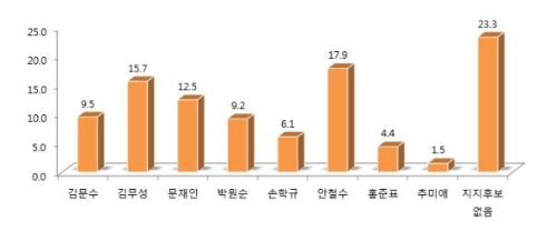 김 의원 다음은 민주당 문재인 의원(12.5%), 김문수 경기도지사(9.5%), 박원순 서울시장( 9.2%), 손학규 민주당 상임고문(6.1%), 홍준표 경남도지사(4.4%) 순이었다. 지지 후보가 없다고 답한 응답자는 23.3%로, 1위인 안 의원보다 5.4%포인트 많았다.