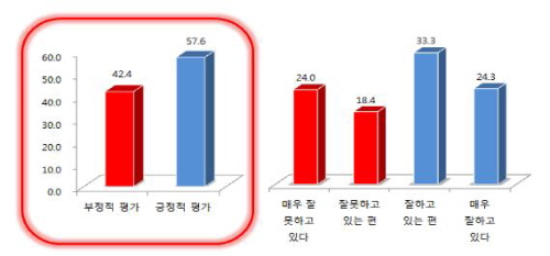 '매우 잘하고 있다 / 잘하고 있다 / 잘못하고 있다 / 매우 잘못하고 있다'는 4가지 보기 중 '매우 잘하고 있다'고 답한 응답자는 24.3%, '잘하고 있다'는 33.3%였다.