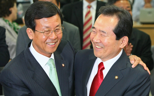 | ▲ 4.29 재보선에서 수도권 지역에서 완승한 민주당의 정세균 대표와 원혜영 원내대표가 29일밤 서울 영등포 민주당사에 마련된 선거상황실에서 최종 승리를 확인한 뒤 서로 얼싸안고 승리의 기쁨을 나누고 있다. ⓒ연합뉴스 |